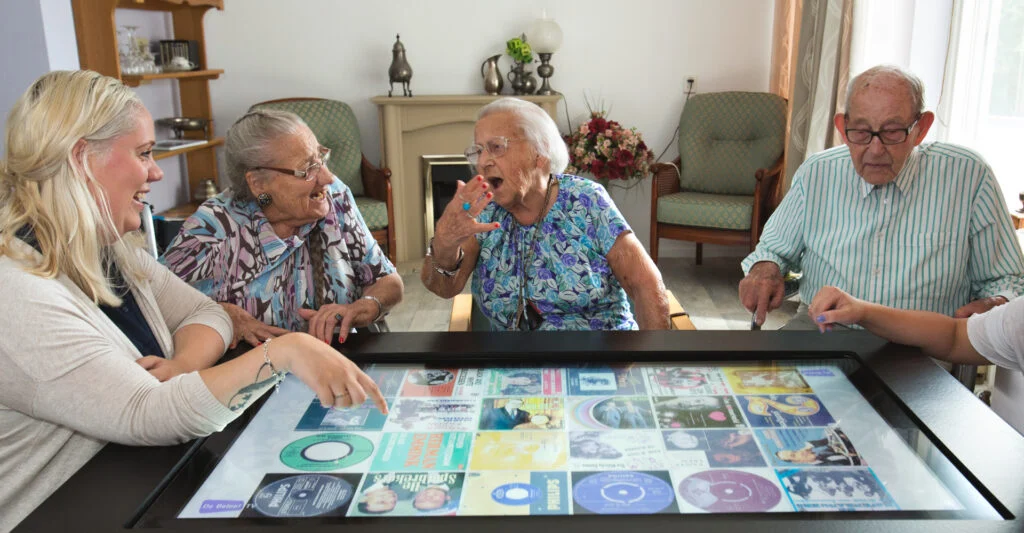 De BeleefTV is een grote, interactieve, mobiele activiteitentafel. Het spelen van stimulerende spelletjes, het luisteren van muziek en het ophalen van herinneringen brengt de bewoners van zorginstellingen dichter bij elkaar en hun omgevin