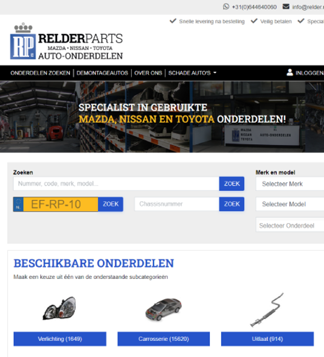 Relder Parts is specialist in gebruikte Mazda, Nissan en Toyota onderdelen, met ruim 50.000 onderdelen op voorraad. Daarnaast een doorlopende voorraad handelsauto's en jonge Nederlandse schadeauto's